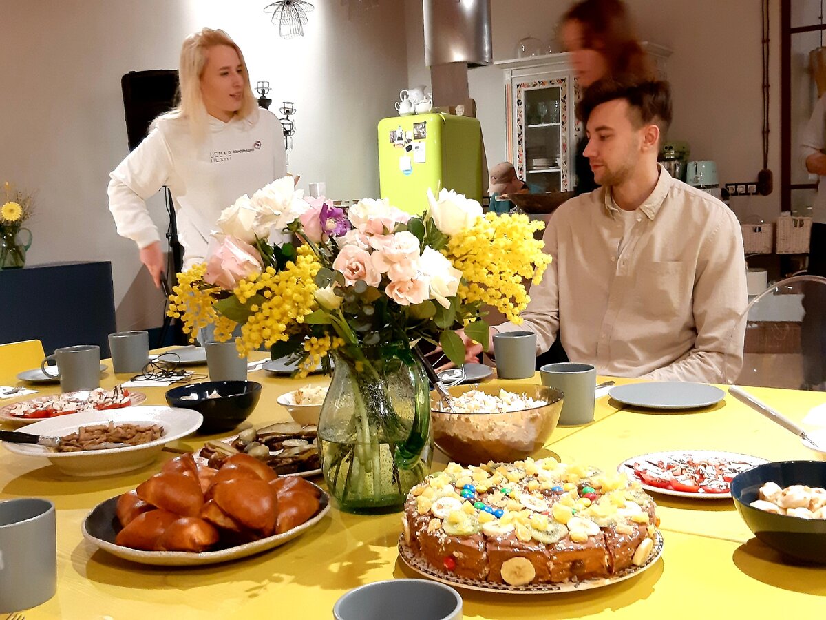 Красивые молодые люди возрастного диапазона 20-30 накрывают красивый стол. Цветы, тортики, салаты, бутерброды с семгой и даже жареные пельмени.