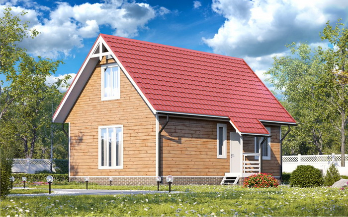 Этот домик понравится тем, кто любит двухэтажные дома. Этот проект подразумевает под собой размещение мансарды, которую каждый обустраивает по своим предпочтениям. На первом этаже размещен стандартный набор комнат, таких как спальня и кухня.