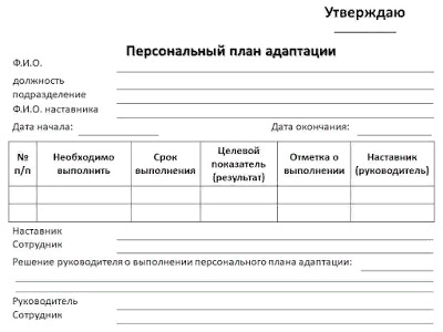 Индивидуальная же часть программы для специалистов и руководителей может представлять собой персональный план адаптации (вхождения в должность и др.). Как показывает практика, для эффективного выполнения индивидуальной части программы (персонального плана), целесообразно назначить для вновь принятого сотрудника наставника (в некоторых случаях нескольких) из числа наиболее опытных (квалифицированных) сотрудников. В случае их отсутствия наставником автоматически становится непосредственный руководитель.