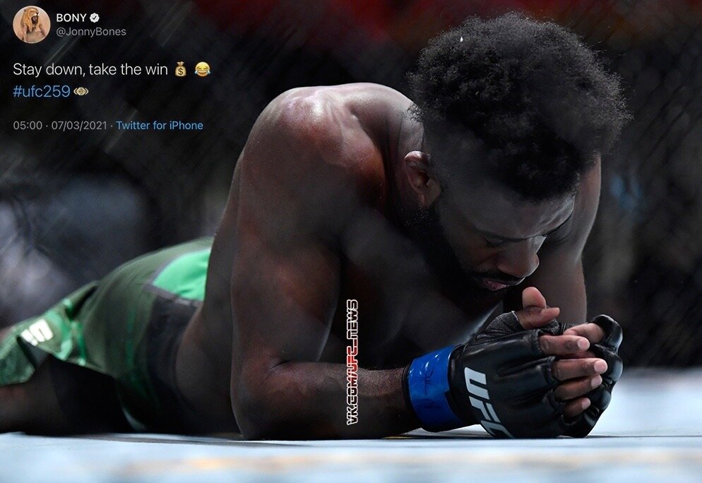 💬«Алджамэйн вышел в отличной форме, он шел вперед каждую секунду этого боя, и не его вина, что он получил запрещенный удар коленом. Поздравляю, Чемпион – ты сделал это», – написал Джонс