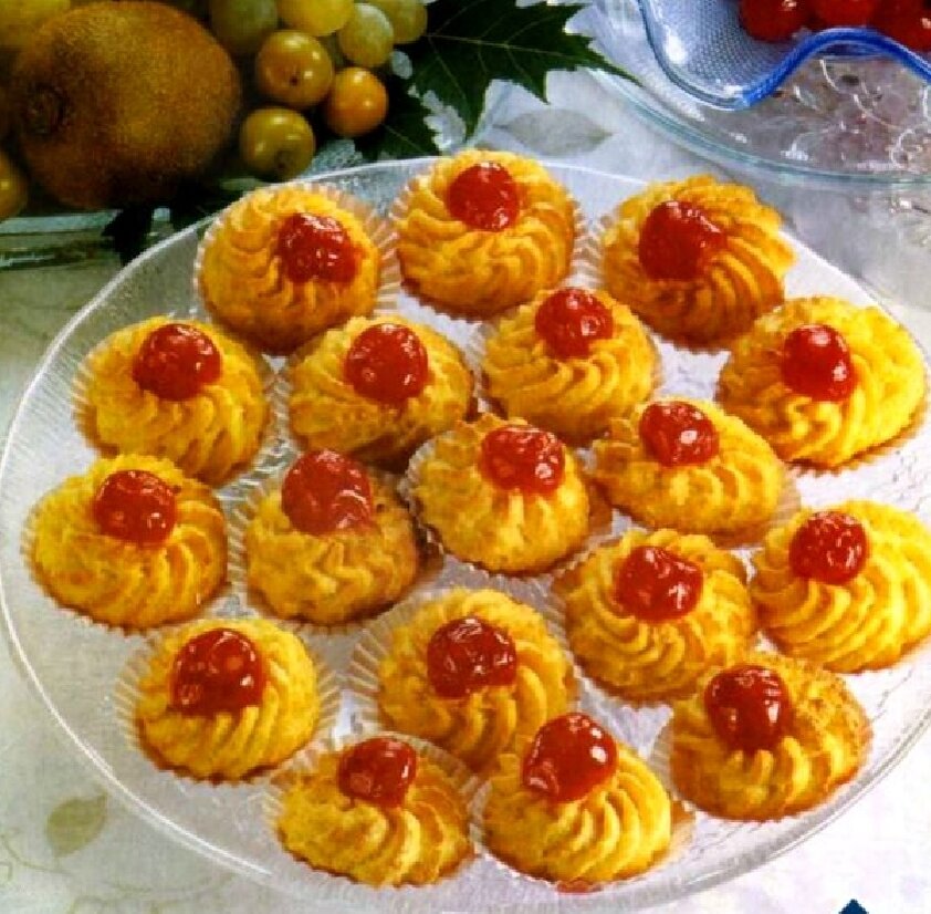 2 яичных белка, 200 г сливочного масла, 4 ст. ложки ванильной сахарной пудры, 300 г муки, вишневый джем или коктейльные вишенки для начинки.