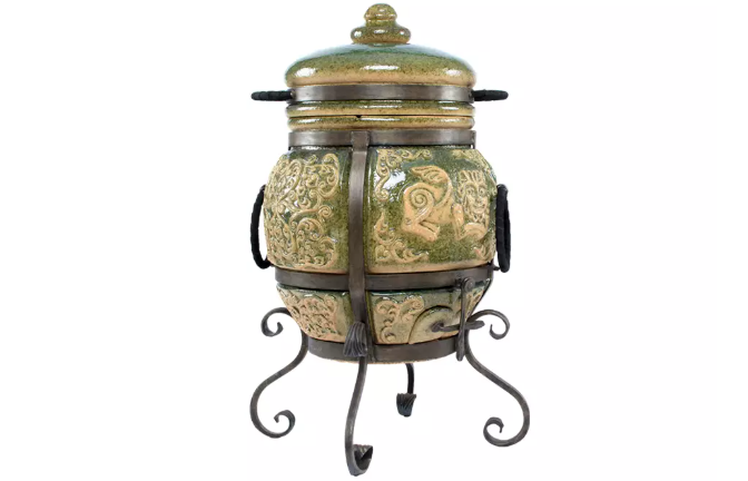 Маленький переносной тандыр "Арслан" обладает целым рядом преимуществ. Модель выпускается в зеленом или бежевом цвете. По бокам тандырную печь украшает орнамент в виде крылатого льва. Изделие изготовлено вручную из шамотной глины, которой не страшны высокие температуры. Не требуется покупать специальную подставку. Высокие ажурные ножки исключают соприкосновение с холодной землей.