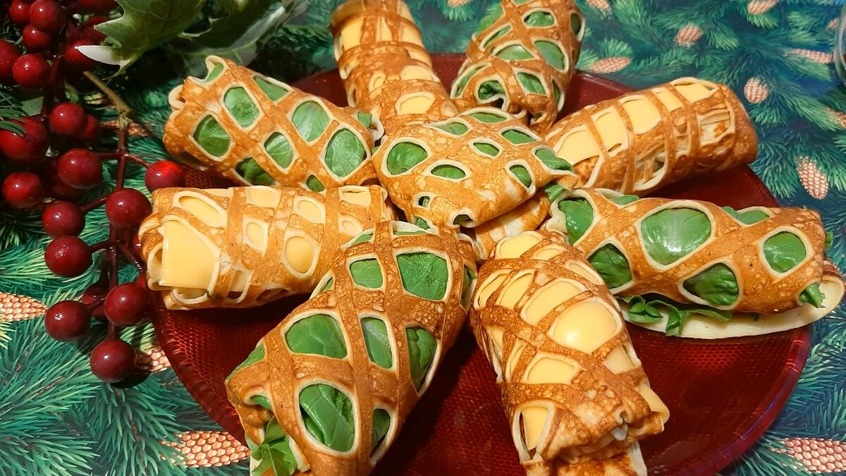 Шаг 10: Выкладываю на тарелку чередуя блины с салатным листом и с сыром и подаю.