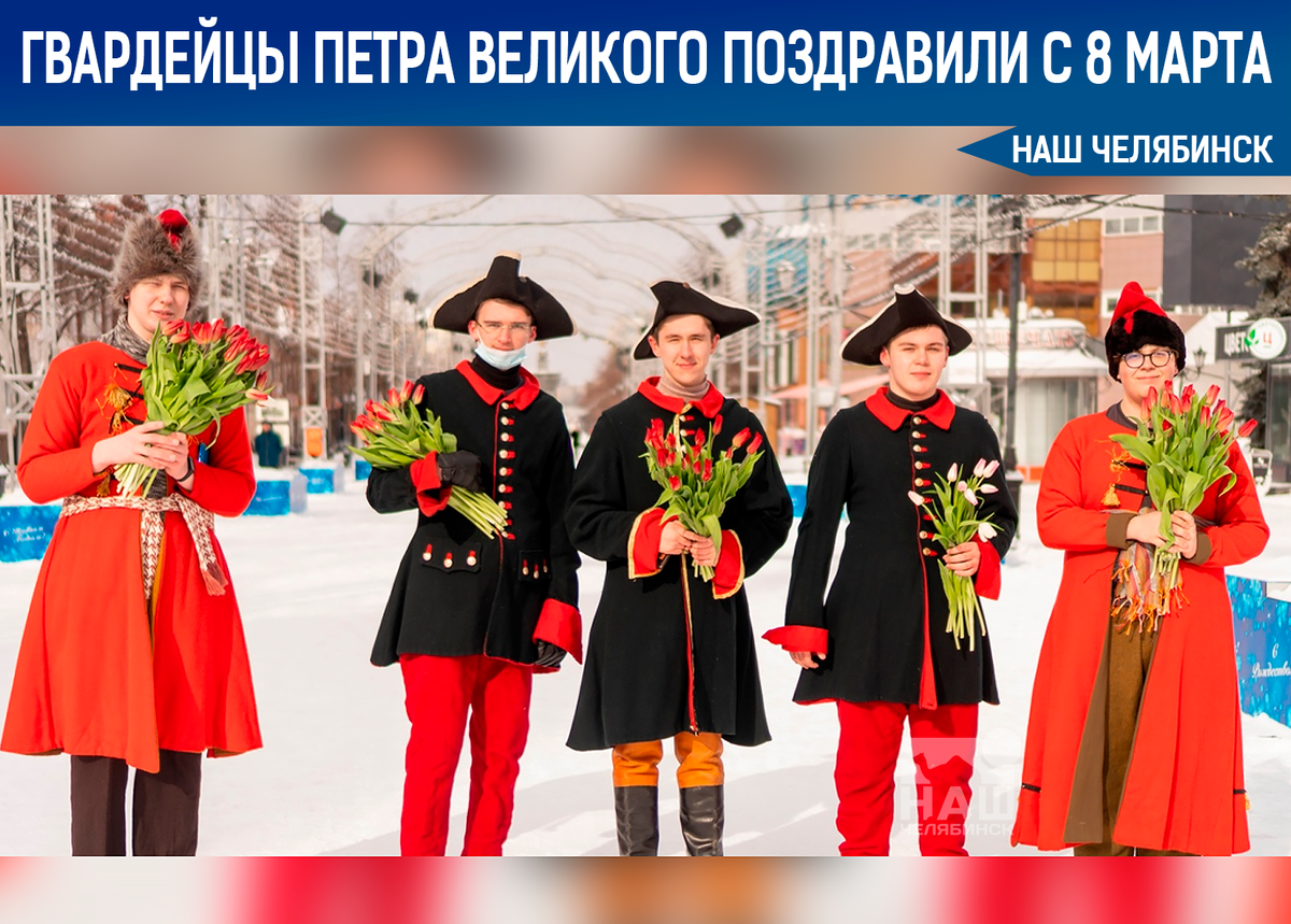 Жительниц Челябинска на Кировке поздравляют с 8 марта гвардейцы Петра Великого. За 2 часа суровые стрельцы Ивана Грозного и гвардейцы Петра I раздали более 500 тюльпанов жительницам и гостьям города.