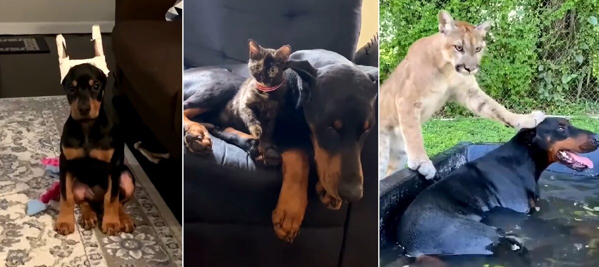 Кстати, слово "добрый", наверно, произошло от слова "доберман". Некоторые из этих собак стали такими добренькими, что могут даже неплохо жить вместе с кошками, особенно с маленькими, поскольку если что, то маленькой кошке можно легко устроить выволочку. Но когда кошка вырастает и становится большой, то с ней, конечно, не так легко справиться.