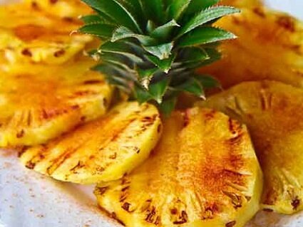 Готовый ананас со всех сторон посыпьте смесью сахара и корицы ( можно это, кстати, прямо на мангале сделать) и подавайте, пока не успел остыть, в самом конце обеда или ужина. Десертное вино? Почему бы и нет.