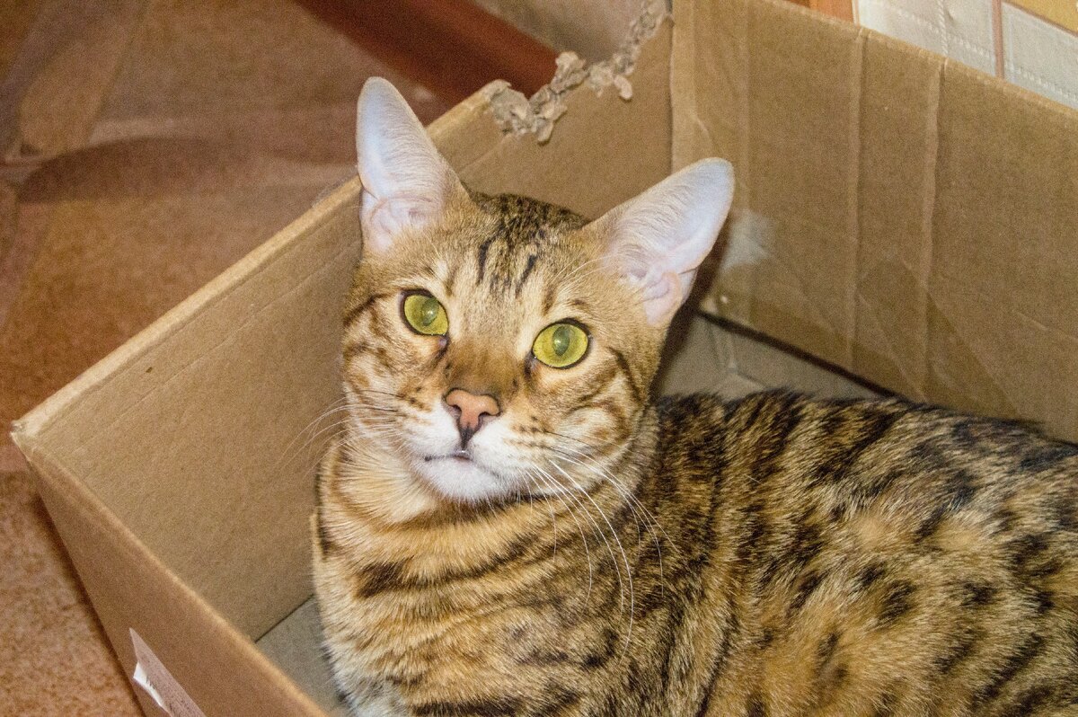 Интересная порода, кот крупнее своих дворовых и домашних собратьев и окрас похож на шкуру леопарда. А в остальном такой же обычный домашний кот, как и все остальные. Точно так же как и все кошачьи, любит сидеть в коробках и грызть их: