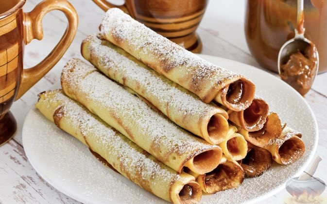 - На готовый блин, равномерно распределяем вареную сгущёнку. Затем скручиваем трубочкой или складываем блин любым способом, каким вам захочется.