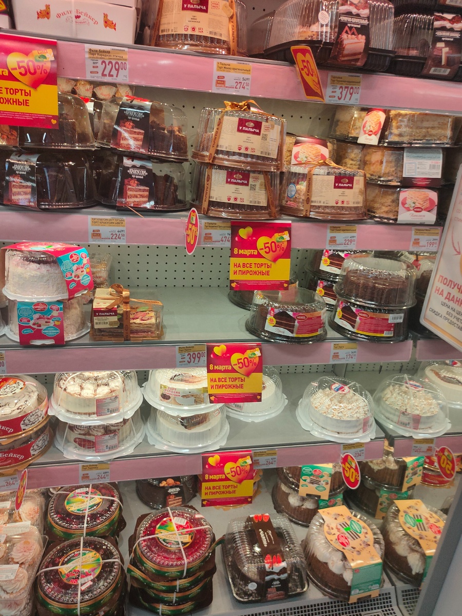 Ранее в статье про акции в Билле был размещен календарь скидок. 8 марта по этому календарю очень кстати была скидка 50% на все торты и пирожные (кроме тех, что по акции на этой неделе).