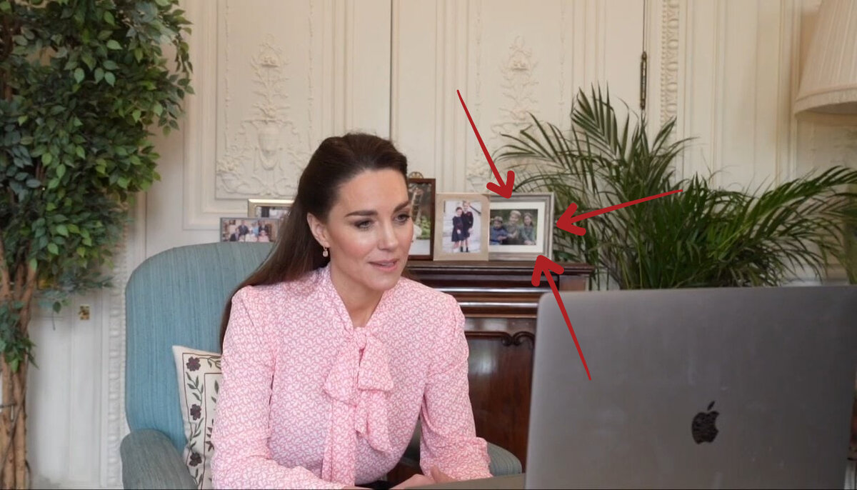 Кстати, совершая видеозвонок, Кэтрин засветила одно из ранее неопубликованных фото их с Уильямом деток - позади Кейт на комоде виднеется одно из новых фото, на котором запечатлены Джордж, Шарлотта и Луи.