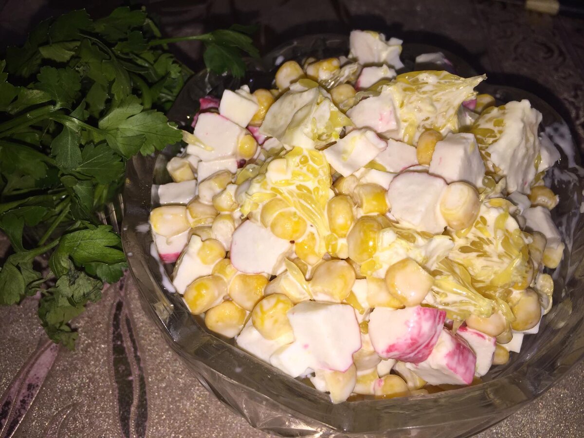 4). Крабовые палочки порезать под стать предыдущим ингредиентам – тоже крупными кусочками.