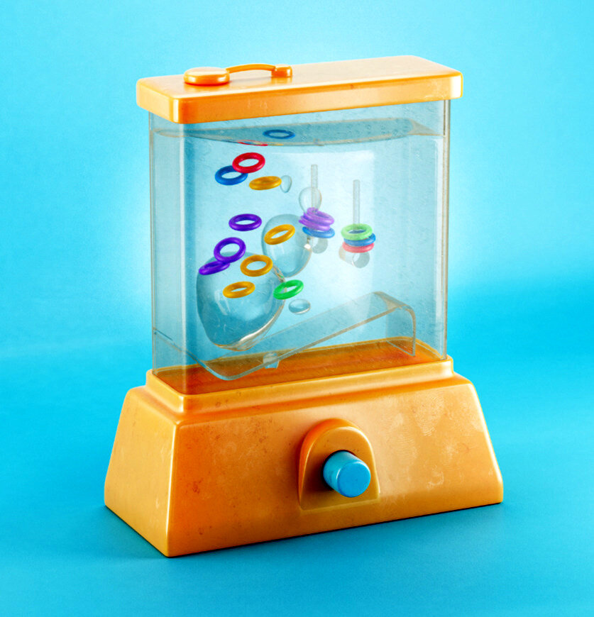 Первый вариант опять же появился в Америке в 1977 году. У нас Тотошу начали выпускать в 1984 году. Советский вариант игры был абсолютно идентичен западному, совпадали даже размер и оформление. Бегемотик был похож на современные автоматы с жевательной резинкой, которые стоят в супермаркетах. Цветные шарики нужно было закинуть в рот Тотоше, и не промахнуться.