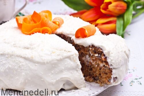 Украшаем по желанию. Можно просто присыпать сверху кокосовой стружкой или орехами. А можно очистить морковь и при помощи картофелечистки сделать тонкие ленточки из моркови. Уложить их сверху на торт.