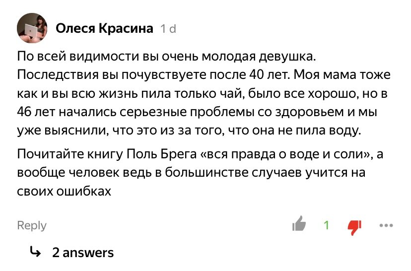 Лучше уж учиться на чужих ошибках, дорогая Олеся. На ошибках людей, которые верят шарлатанам, выдающим себя за врачей, гомеопатам, гадалкам и провидцам. Советую вам пореже давать советы о том, в чем вы не разбираетесь. И не забывайте употреблять соль, она человеку жизненно необходима.