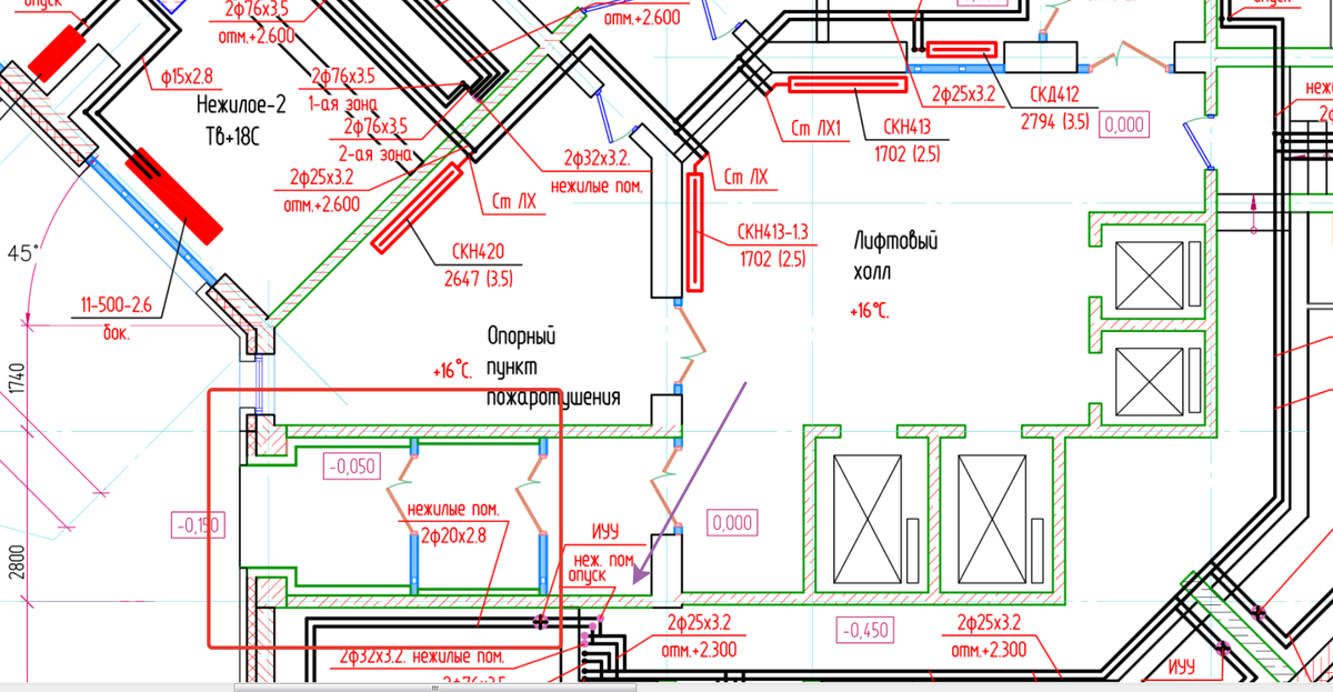 Пришел вопрос. Читал вашу статью с разбором ошибок и не понял ваше замечание, насчёт расположения приборов отопления во втором тамбуре. Проектировщик заложил их в лифтовой холл, тем самым перекрыл теплопотери. Зачем тогда располагать в тамбуре? Плюс у нас в СП запрещается установка отопительных приборов и прокладка труб через тамбур, пункт на память не вспомню. Может у него в ХОВс прописана тепловая завеса, что тут не отображена? Тогда вполне можно расположить в холле прибор. Второй момент, если мы располагаем данный прибор во втором тамбуре, то в обратку температура будет весьма с пониженными показателями уходить, а данный прибор явно не отдельной веткой от ИТП идёт...скорее всего на МОПах этот прибор весит и если мы имеем данное помещение, плюс ЛК будет остывание теплоносителя. Да и вообще....если делать расчет, то теплопотери дикие будут, Тогда прибор не влезет, если только не в 2 ряда располагать. Просто не могу вспомнить, чтобы ещё где-то видел решение с расположением прибора во втором тамбуре.