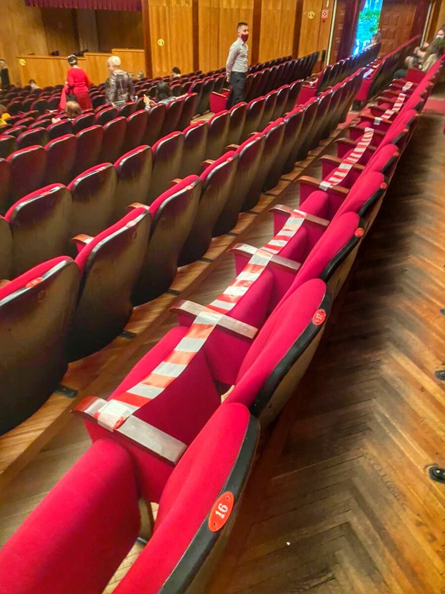 Теперь зрители сидят в зале через три места друг от друга. Чтобы никто не нарушил это предписание, кресла перетянуты лентами. Соответственно ни о каком аншлаге в зале речи не идёт. Хотя и день праздничный, и на сцене премьера.