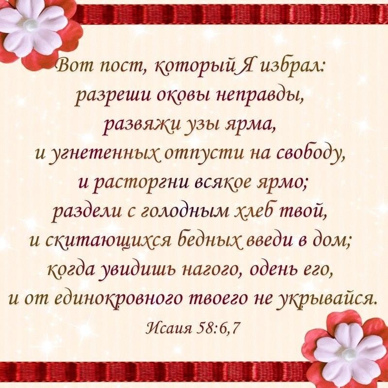 «…было слово Господне к Захарии… когда Вефиль послал… помолиться пред лицем Господа и спросить у священников… и у пророков, говоря: … плакать ли мне в пятый месяц и поститься, как я делал это уже много лет? И было ко мне слово Господа Саваофа: «Скажи всему народу земли сей и священникам так: «Когда вы постились и плакали в пятом и седьмом месяце… для Меня ли вы постились? Для Меня ли? И когда вы едите и когда пьете, не для себя ли вы едите, не для себя ли вы пьете? … производите суд справедливый и оказывайте милость и сострадание каждый к брату своему; … зла друг против друга не мыслите в сердце вашем…». Но они не хотели внимать, отворотились от Меня… чтобы не слышать. И сердце свое окаменили, чтобы не слышать закона и слов, которые посылал Господь… И было: как Он взывал, а они не слушали, так и они взывали, а Я не слушал, говорит Господь…» (Захария 7:1-13). «Они же сказали Ему (Христу. — А.О.): «Почему ученики Иоанновы постятся часто…, также и фарисейские, а Твои едят и пьют?» (Лк. 5:33). «Два человека вошли в храм помолиться: один фарисей, а другой мытарь. Фарисей… молился… так: «Боже! Благодарю Тебя, что я не таков, как прочие люди… или как этот мытарь: пощусь два раза в неделю…» Мытарь же, стоя вдали, не смел даже глаз поднять… но… говорил: «Боже! будь милостив ко мне, грешнику!» Сказываю вам, что сей пошел оправданным… более, нежели тот: ибо всякий, возвышающий сам себя, унижен будет, а унижающий себя возвысится» (Лк. 18:10-14). «Также, когда поститесь, не будьте унылы, как лицемеры; ибо они принимают на себя мрачные лица, чтобы показаться людям постящимися. Истинно говорю вам, что они уже получают награду свою. А ты, когда постишься, помажь голову твою и умой лицо твое, чтобы явиться постящимся не пред людьми, но пред Отцом твоим. Который втайне; и Отец твой, видящий тайное, воздаст тебе явно» (Мф. 6:16-18).
