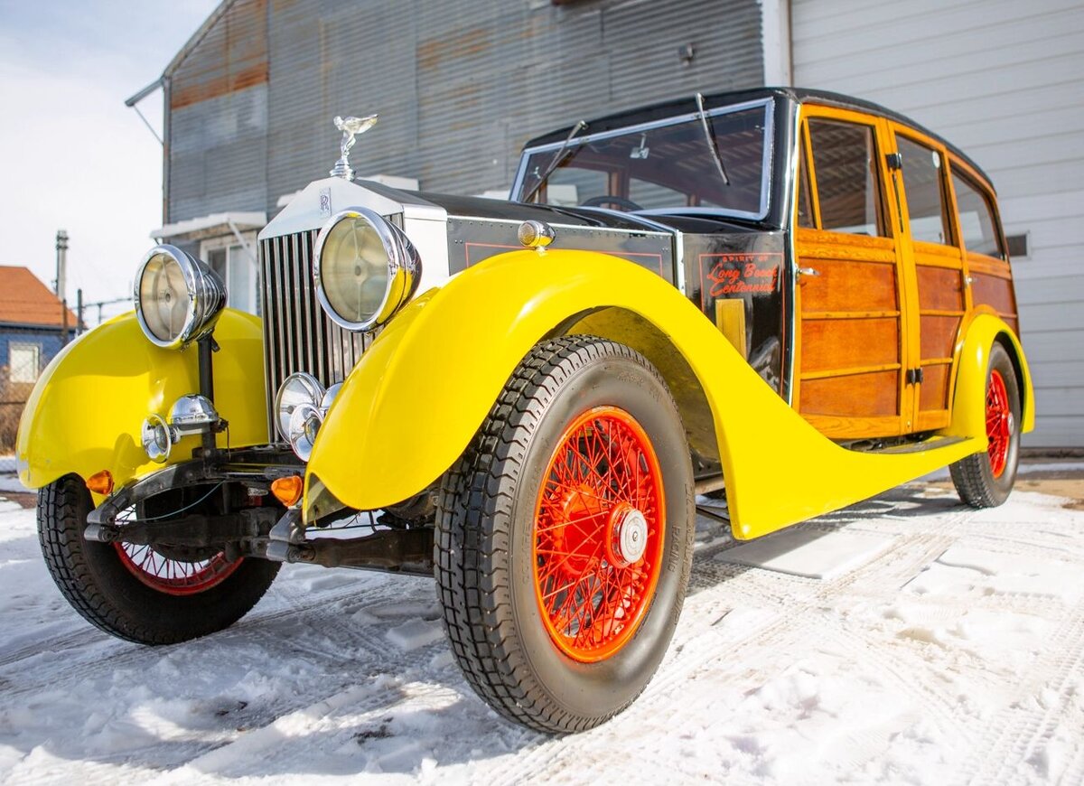 Это Rolls-Royce 20/25 1931 года выпуска, и он уникален. Кузов вагон, по-нашему универсал, сделанный из дерева. Натуральный вудди-стайл. Такие кузова были в основном на недорогих американских коммерческих фургонах, но что бы на RR , да еще и в такой веселой раскраске. Вот уж действительно шут в королевской семье затесался.