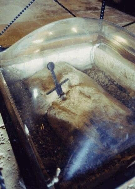 Этот меч король Артур добыл при содействии волшебника Мерлина — его держала над водами таинственная рука (рука Владычицы озера ) — после того, как потерял свой меч в поединке с сэром Пелинором.