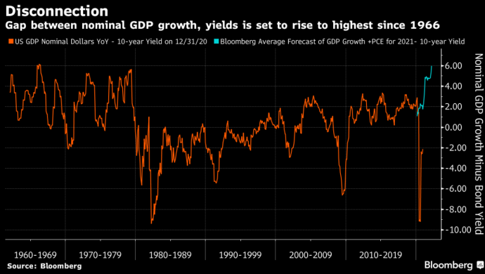 Аналитики повышают свои прогнозы роста и инфляции, поскольку американцы находятся на пороге получения чеков по стимулированию экономики в соответствии с пакетом президента Джо Байдена на 1,9 триллиона долларов. Согласно опросам Bloomberg, средний прогноз роста номинального валового внутреннего продукта достиг 32-летнего максимума в 7,6%. Даже после удвоения до 1,6% с ноября ставки по 10-летним облигациям с трудом поспевают за повышением темпов роста, в результате чего разрыв между ними, вероятно, будет самым большим с тех пор, как Линдон Джонсон был президентом.