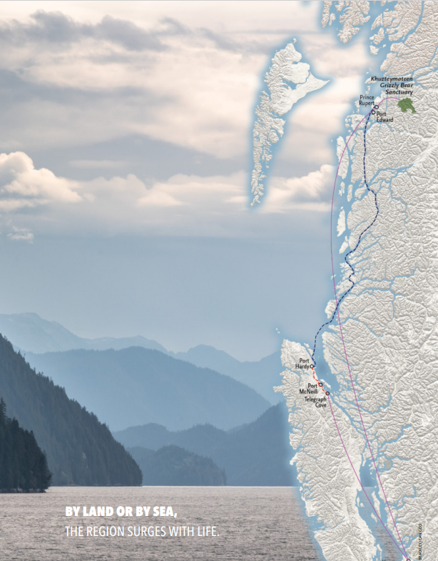 Внутренний проход Северной Америки может быть единственным местом на Земле где вы увидите кормящихся горбатых китов прямо у берега, в то время как медведь гризли и два медвежонка кормятся мидиями на соседнем пляже. По суше или по морю этот регион бурлит жизнью. Площадь, охватывающая центральную и северную части береговой линии провинции, составляет около 500 километры от Порт-Харди до Принс-Руперта, простирающиеся вглубь страны до Прибрежных гор.