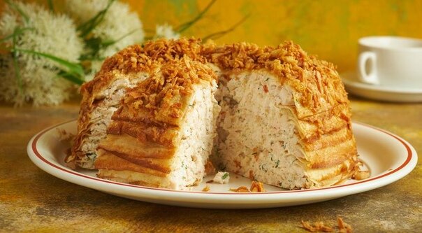 7. Верх блинного пирога с курицей смажьте тонким слоем творожного сыра и посыпьте жареным луком. Уберите в холодильник на 1 час. Перед подачей можно украсить зеленью.