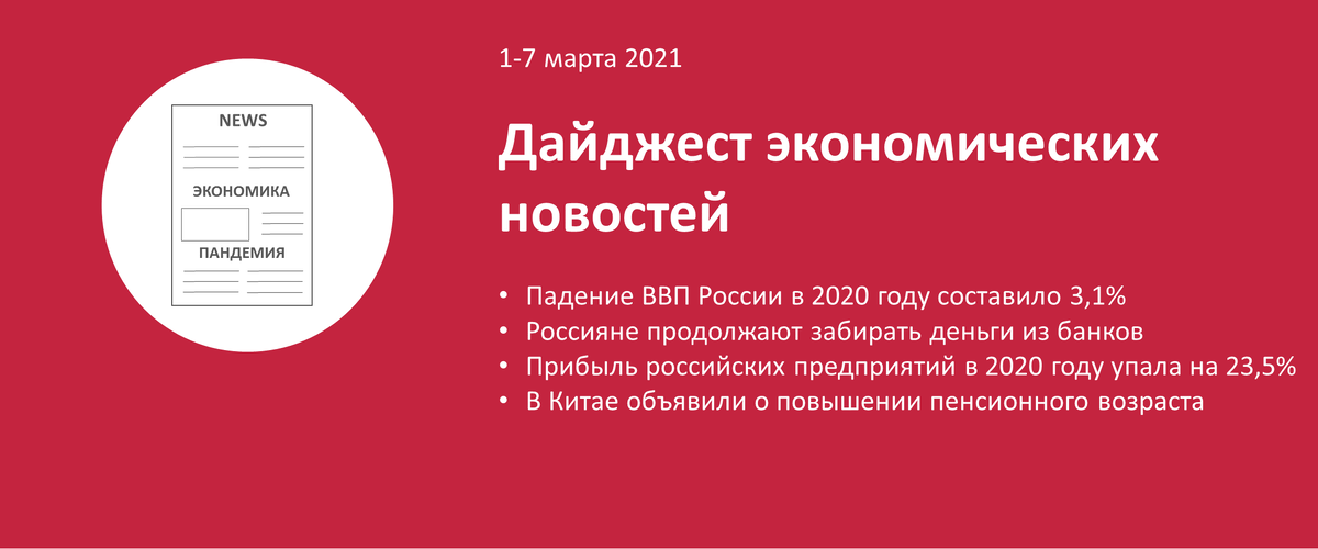 - Россия перенесла кризис, вызванный распространением коронавируса, лучше мира в целом («Центр развития» ВШЭ), в долларовом выражении сокращение ВВП России в 2020 году составило почти 10% (Forbes), инфляция в России в феврале в годовом выражении составила 5,67%, в месячном — 0,78% (Росстат)