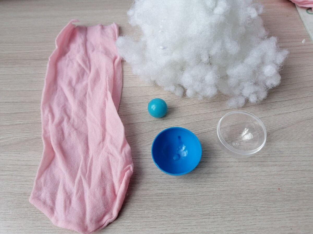 Делаем два небольших шарика из капрона и синтепона. Это будут ручки.
