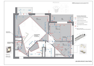 Даже если мастер отделывал квартиры сходной планировки, ваш вариант отличается хотя бы деталями. Поэтому на первом этапе составляется план помещений, расстановки мебели и монтажа светильников (с указанием типа).