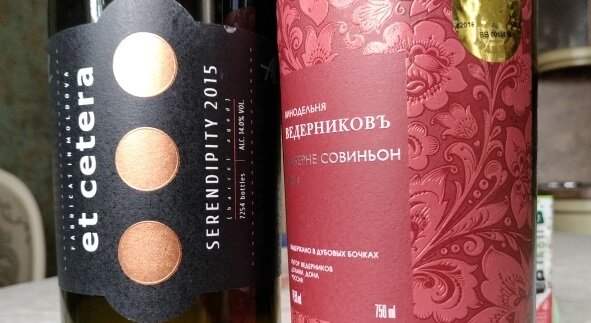 В сравнимую цену, 1,8 тысяч рублей на наши деньги, мне обошлась и бутылка вина Et Cetera от молдавского винодела Лукьянова. Как написано на этикетке, уже второе поколение этой семьи занимается вином. Вино Serendipity из купажа фетяска негра и саперави урожая 2015, тираж небольшой, 7254 бутылки, которые пронумерованы вручную. У нас не продаётся.