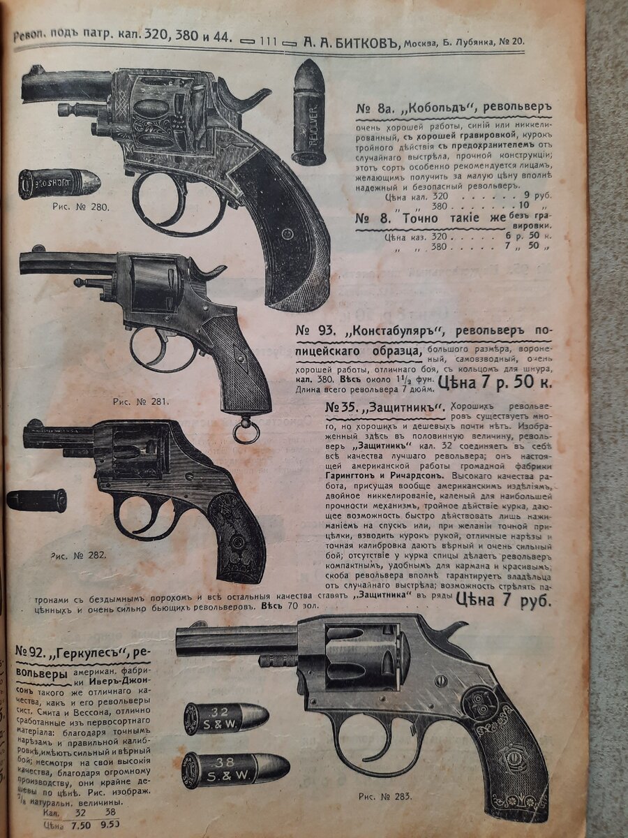 Сегодня мы продолжаем обзор прейскуранта оружейного магазина купца Биткова за 1910 год, который располагался в Москве, на Лубянке. Я уже сделал выпуск с охотничьими ружьями (ссылка в конце статьи). Впереди еще будут выпуски с винтовками и охотничьим и походным снаряжением, не пропустите.