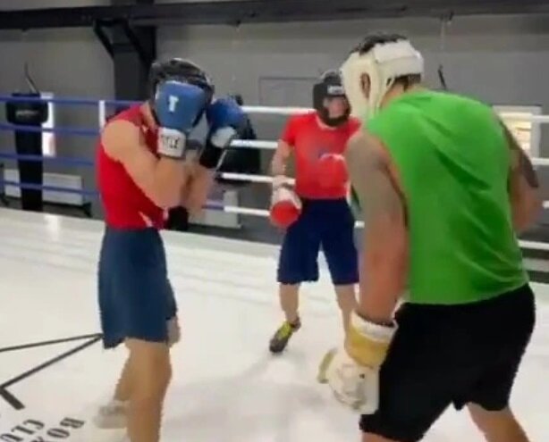 На нем чемпион боксирует сразу с двумя спарринг-партнерами. Видео было подписано следующим образом: «Двойной удар. Часть первая».