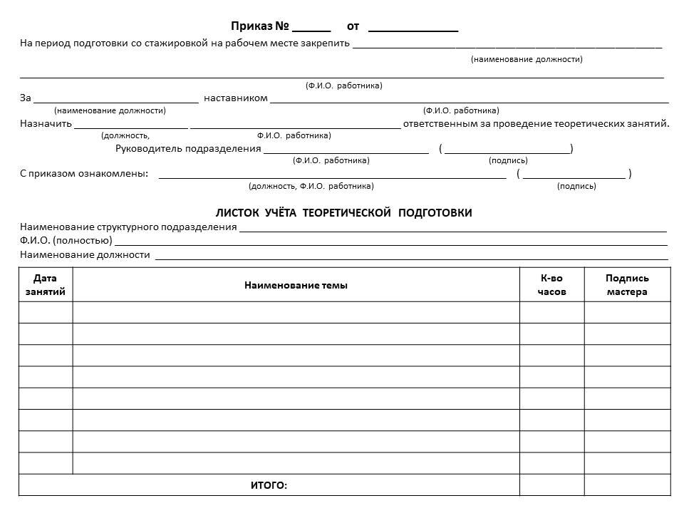 Поскольку более распространён второй вариант, на нём и остановимся. Как правило, этот процесс проходит под непосредственным руководством мастера производственного участка, на котором и будет осуществлять свою трудовую деятельность рабочий. Мастер же и несёт ответственность за качество адаптации и подготовки рабочего. Для обеспечения качества подготовки (переподготовки) рабочего мастер может привлекать профильных специалистов в качестве консультантов в процессе теоретической подготовки. Особенно это важно в том случае, если функциональные обязанности рабочего сопряжены со взаимодействием с другими структурными подразделениями, участвующими в производственном цикле. Из числа ответственных высококвалифицированных (опытных) рабочих назначается наставник, который и закрепляется за вновь принятым (переведённым) рабочим. Список рабочих, которые могут выступать в качестве наставника, как правило, утверждается соответствующим руководителем (Генеральным директором, Директором по производству, Директором по персоналу и др.) ежегодно. Для повышения мотивированности рабочего в качестве наставника, его труд целесообразно оплачивать дополнительно. Как правило, наставник закрепляется за вновь принятым (переведённым) работником руководителем структурного подразделения в первый его рабочий день. В этот же день работнику выдаётся документ, в котором отражён весь перечень необходимых для освоения теоретических знаний и в котором будет отмечаться процесс освоения этих знаний. Название, форма, содержание данного документа, как правило, определяется предприятием самостоятельно, исходя из его специфики. Он, например, может называться "Листок учёта теоретической подготовки" и иметь следующую форму: