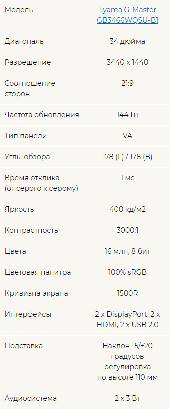 Ассортимент изогнутых геймерских мониторов диагональю 34 дюйма с разрешением 3440 x 1440 и частотой обновления 144 Гц постоянно увеличивается, так что таким сочетанием характеристик уже никого не удивишь. Но на общем фоне Iiyama G-Master GB3466WQSU-B1 берет ценой: он заметно дешевле ближайших аналогов, при этом не уступает в качестве.
