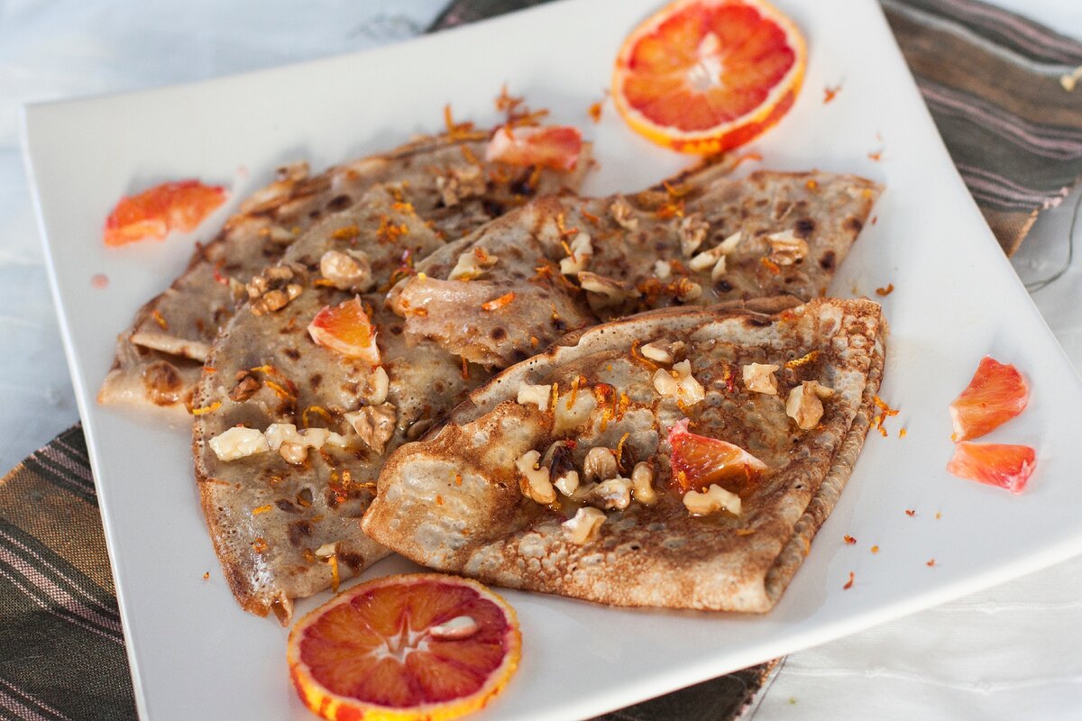 В сковороде смешайте сок апельсинов, немного цедры, сливочное масло, мёд и рубленые орехи, проварите на небольшом огне 2 минуты. Готовые блины сверните треугольничками и прогрейте в получившемся соусе 2 минуты. Подавайте горячими.