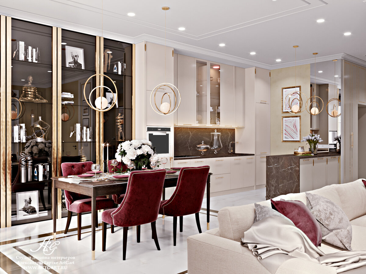 Кухня в современном стиле с элементами ар-деко #новочеремушкинская_110м Фасады гладкие глянцевые, темно-коричневая столешница добавляет контраста и переходит на фартук. Так как остров будут использовать как дополнительное место для готовки, стену, в практических целях, мы оформили зеркалом. Заодно столешница визуально становится бесконечно длинной и приумножаются светильники💡 Кухню продолжает витрина с подсветкой. Если подсветку выключить, то содержимое окажется скрыто от глаз, что удобно, если, вдруг, за стеклом образовался беспорядок. Обратим внимание, что все светильники для этого проекта при разнице форм соответствуют одному слову: плавность. Главными параметрами для нас были округлость формы и обтекаемость линий! Не забудьте подписаться на канал Сайт INSTAGRAM YOU TUBE Заказать дизайн и ремонт: +7 (499) 346-62-29 ; +7 (969) 034-60-46 #дизайн интерьера #дизайн проект квартиры #дизайнер интерьера #дизайн проект #дизайн дома #дизайн квартиры #неоклассика #designinteri