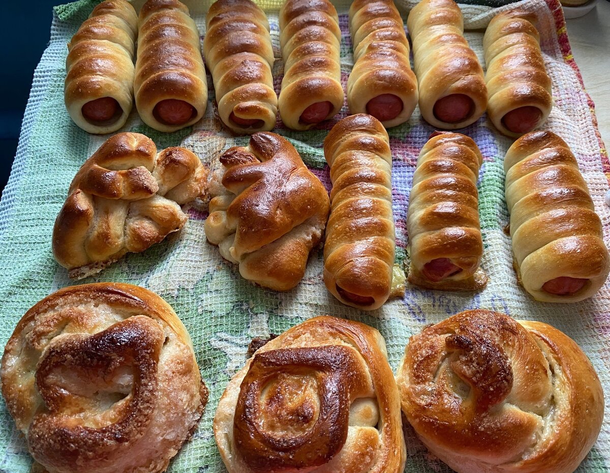 Начинка может быть любая, у меня сегодня сосиски 10 шт., а ещё я сделала плюшки и лапки, для них нужен сахар и растительное масло. Как-нибудь поделюсь рецептами пирогов с другими начинками.