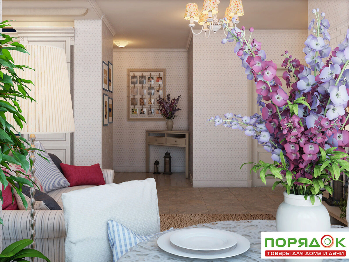 Приятную атмосферу семейного отдыха помогут поддержать красивые цветочные композиции, расставленные на журнальных столиках, консолях, в витринах посудных буфетов. Дизайнеры советуют разместить сразу две композиции из одинаковых цветов, но разных по размеру и форме в разных углах комнаты.
