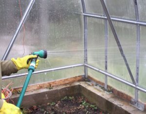 Необходимо вымыть каркас и поликарбонат мыльным раствором внутри и снаружи. Если растения чем-то переболели, то можно добавить нужный препарат в мыльный раствор.