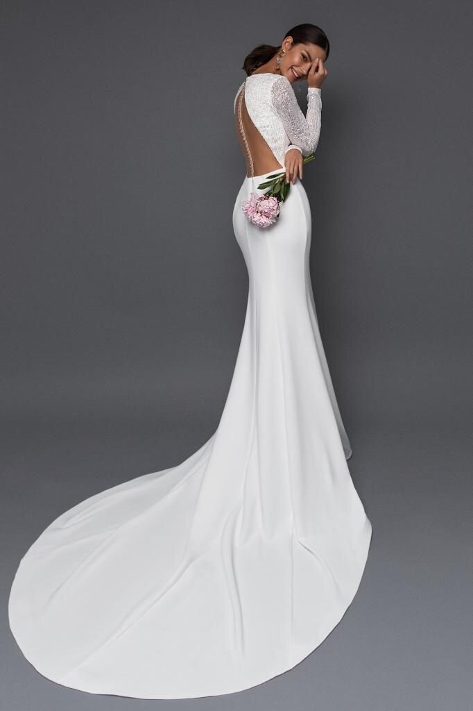 Открытые спинки в свадебном платье демонстрируются уже несколько сезонов, сейчас они стали еще более популярными. При этом перед платья может быть глухим и дополнен длинным рукавом. Так сказать, классика в современном исполнении. Казалось бы скромное платье, пока вы не сделали разворот на 180 градусов.