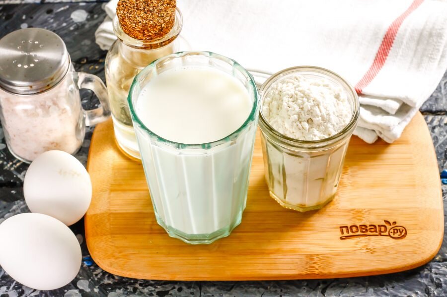Вбейте куриные яйца в глубокую емкость, добавьте молоко комнатной температуры, сахар, соль и взбейте все венчиком примерно 1-2 минуты.