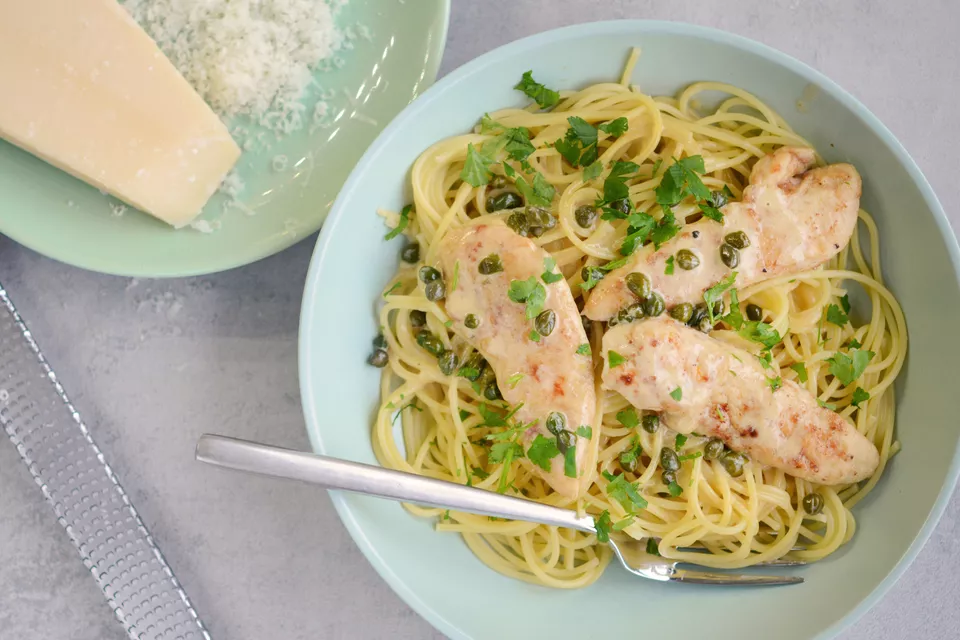 Пикката с курицей - очень популярный способ приготовления курицы, к тому же простой. Курицу слегка посыпают мукой, быстро обжаривают и подают с классическим соусом пикката, приготовленным из вина, лимона, каперсов и сливок, а иногда и с петрушкой. Здесь он сочетается с пастой, и какой комбо они делают. Блюдо готовится довольно быстро, так что поужинать на столе можно чуть более чем за 30 минут.