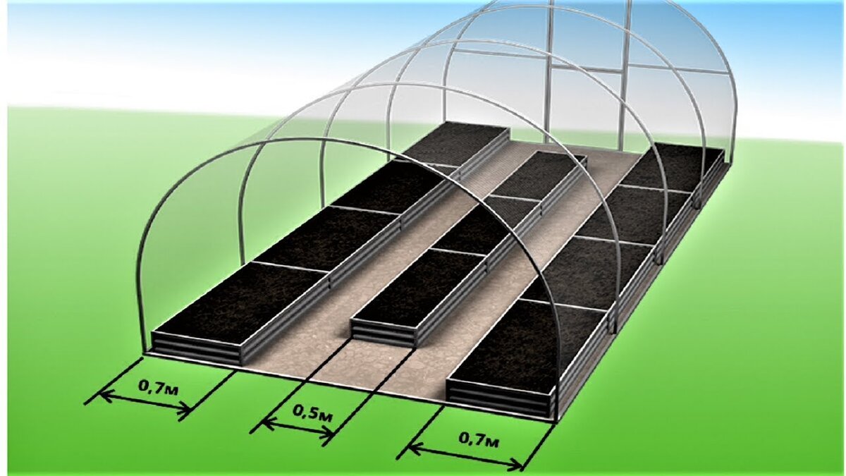 В зависимости от ширины теплицы, в ней устраивают две или три грядки. При ширине сооружения в 6 метров рекомендуется сделать: два прохода по 0,55 метра; две грядки вдоль стен по 0,6 м; центральную грядку шириной 70 см. При такой ширине удобно ухаживать, легко можно дотянуться до любого растения. Как правило, двери в теплице расположены в торцах, что позволяет создавать сквозняк при проветривании. Поэтому центральную грядку лучше отвести под томаты. Им очень нужно проветривание и циркуляция воздуха. У подножья помидорных кустов можно разместить рядочек кинзы, петрушки. Они не помешают томатам, но запахом отпугнут некоторых вредителей. Например, белокрылке не нравится аромат кинзы.