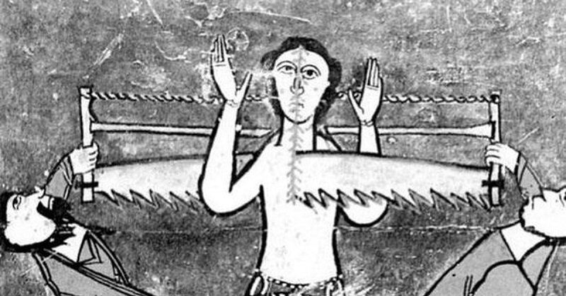 Применялся в Средневековье. Подсудимого ставили ногами вверх, раздвигали ноги в стороны и пилили незаточенной пилой.