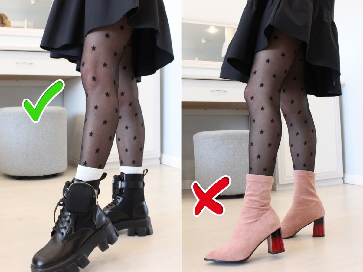 Но всё же встречаются не самые удачные комбинации. Если вы сомневаетесь, какую обувь надеть с яркими колготками или как носить фантазийные с рисунком, эта статья будет для вас полезна.