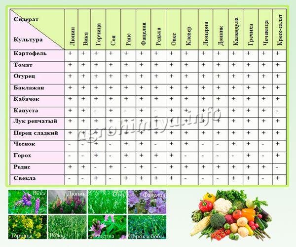 - Благодаря такой таблице вы можете определить именно тот сидераты, который подойдёт вашей культуре,потому что неправильно подобранный сидерат может "призвать" болезни и ненужных насекомых.