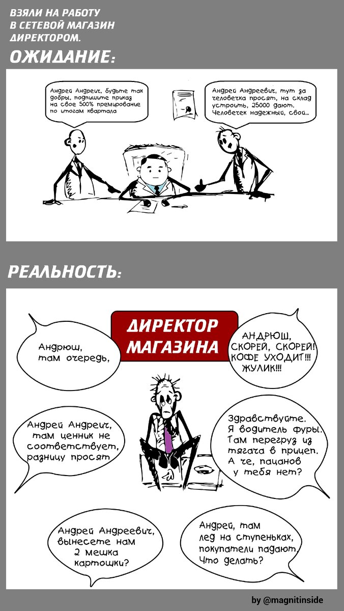 «Что же вы там делали, трутни? Чем были заняты?»,— снова слышу немые укоризненные вопросы. Ребят, мне стыдно, но то же самое, что в Магните делали всегда: забывали снять просрочку, поменять ценники, протереть полки, сесть за кассу, выложить товар и так далее. Хотя магазины выглядели чище и привлекательней. Да и за потери свыше 0,4% увольняли и директора, и товароведа, и персонал. За 0,5%.