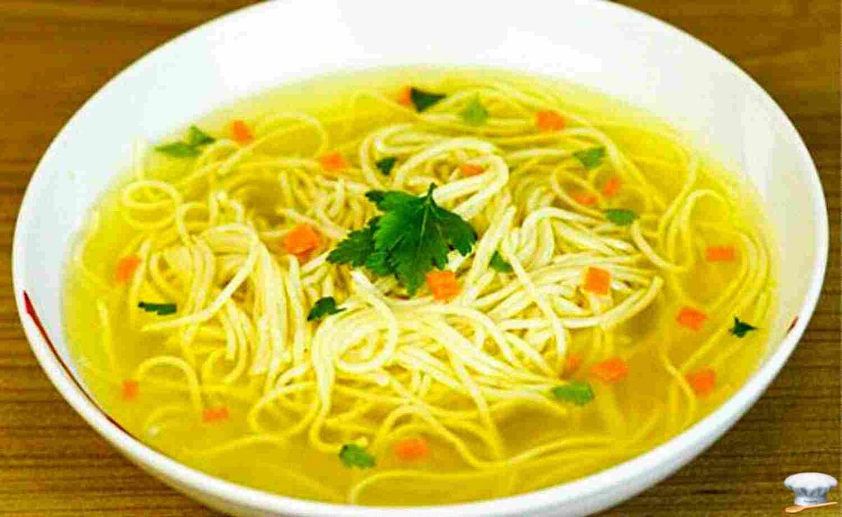 Куриный суп с лапшой домашней. Столовская лапша в СССР готовилась без воды, тесто замешивалось только на яйцах, на 1 яйцо – 100 г муки. Такой порции лапши хватает на три литра супа.