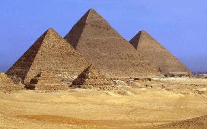 Самые высокие (" Великие ") пирамиды возведены в эпоху Древнего царства недалеко от города Мемфис , тогда он был столицей Египта . Фараон Хуфу , котрого греки называли Хеопс и Хафра ( Хефрен ). Первая из них в древности была высотой 146 , 7 м , а вторая - 143 , 5 м . От времени их вершины сильно пострадали и сейчас они на несколько метров ниже . При строительстве таких огромных сооружений архитекторам приходилось решать осень сложные технические задачи . Пирамида Хуфу сложена из 2 млн 300 тыс . каменных блоков . Вес каждого около 2 , 5 т . Общий вес пирамиды 6 , 5 - 7 млн . тонн . Следовало рассчитать так , чтобы давление на внутренние помещения - галереи , погребальные камеры , святилища - распределялись равномерно и пирамида не обрушилась вовнутрь от собственной тяжести .