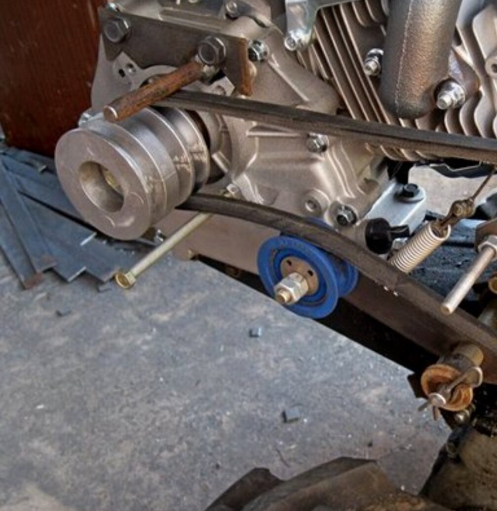 Первый шкив устанавливается на двигателе и имеет как правило либо один ручей или два. Выбор того сколько ремней поставить, напрямую зависит от нагрузки аппарата. Это надо учитывать сразу. Скажу что система с двумя ремнями гораздо лучше и имеет больший ресурс. Ограничители нужны для того что бы ремни приподымались во время выжимания педали сцепления. Тем самым малый шкив начинает прокручиваться параллельно ремням, в этот момент сцепление срабатывает.